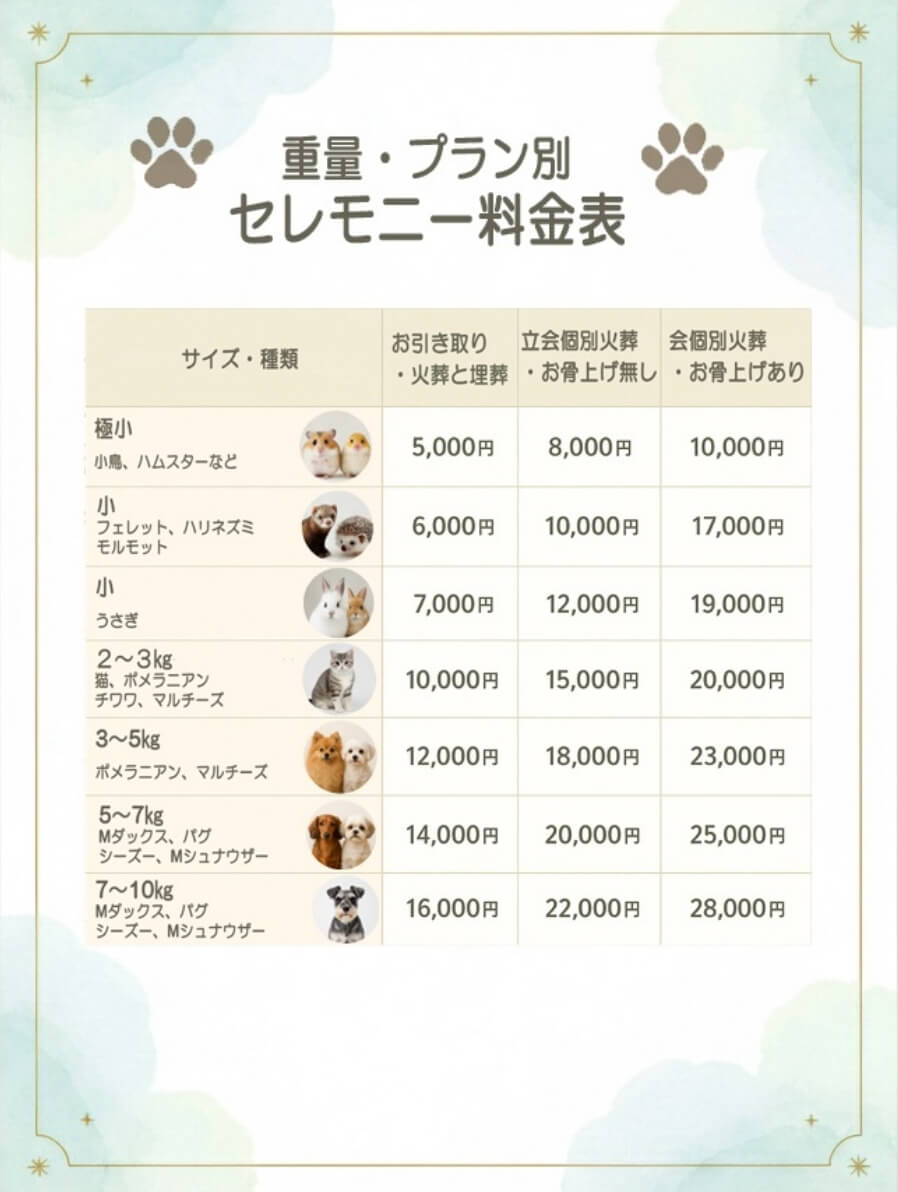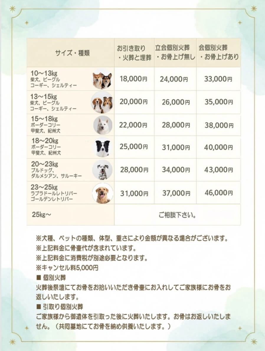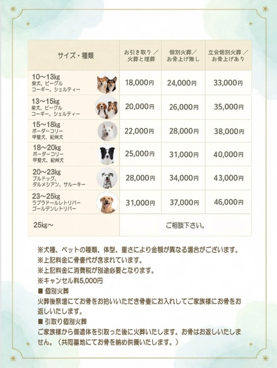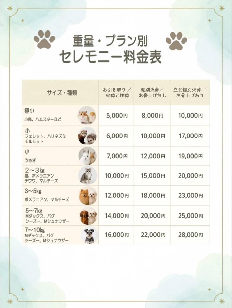 料金表は主要なペットの体重別で記載しておりますが、犬種、ペットの種類、体型、重さにより金額が異なります。
